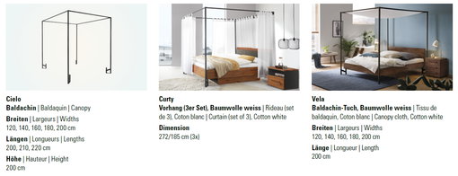 If you prefer it more romantic then simply add the cielo structure, curtains and top to convert the pulciano frames into a 4-poster bed. The structure is available in white or anthracite, curtains and canopy in white.