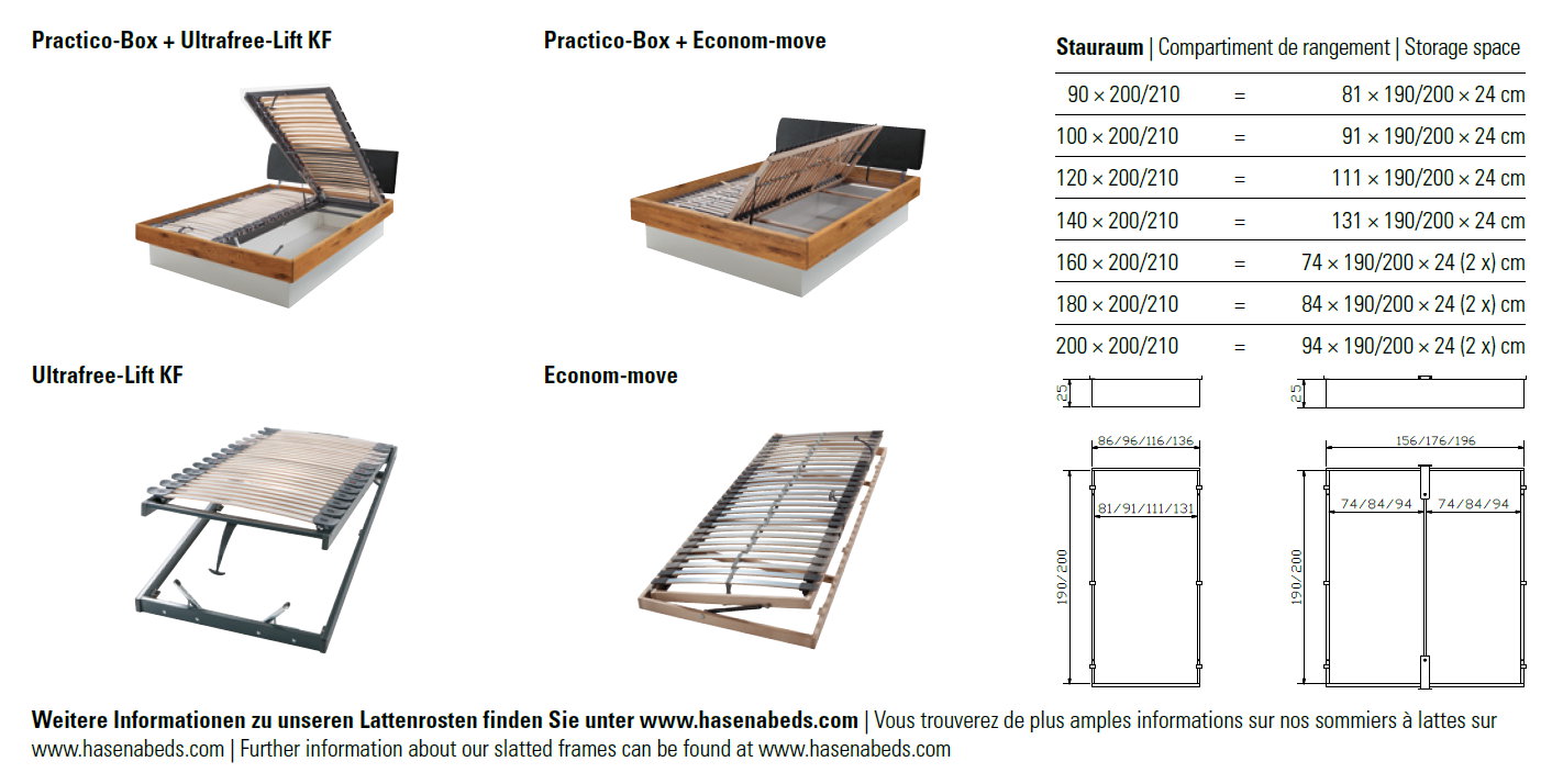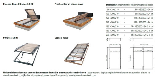 As within the whole HASENA range there are numerous combinations of bedframe, feet and headboards as well as bedside tables, chests of drawers and other accessories.