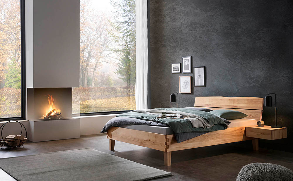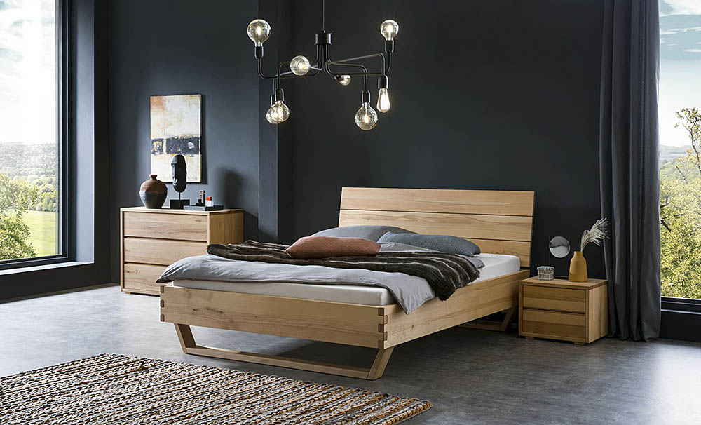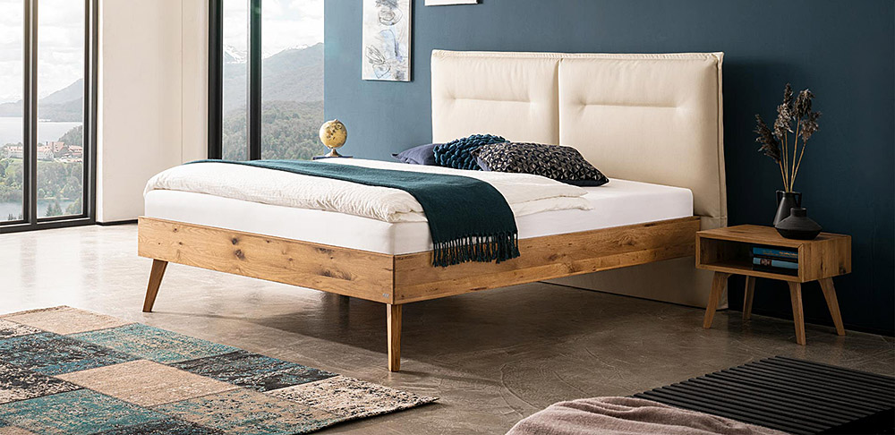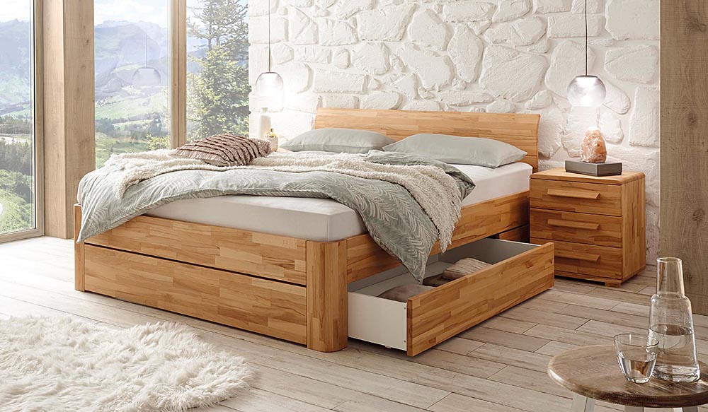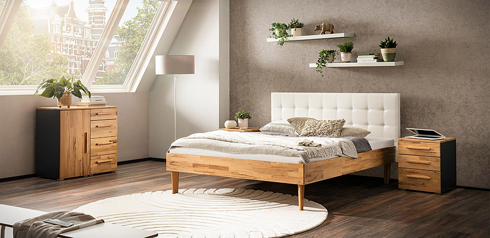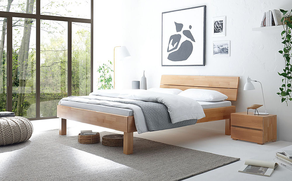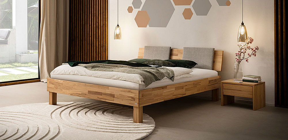 Three different bedframe profiles (16, 18 and 23 cm height) made from beech, heart beech or oak.