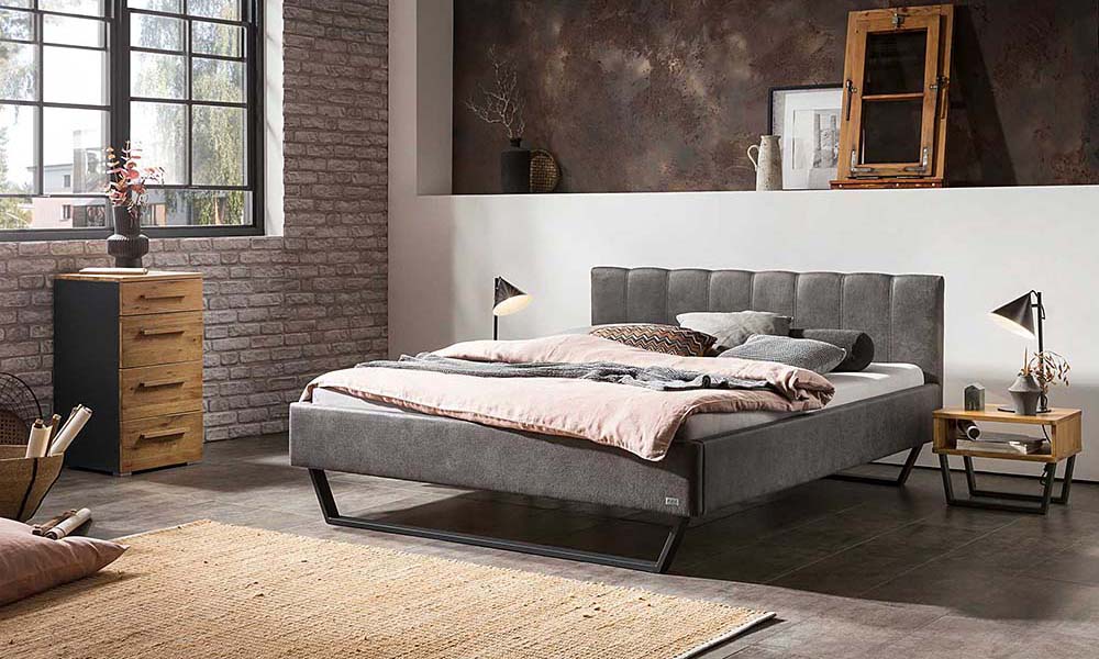 Bedframe Lounge 18 with metal skids Glyn and headboard Wave