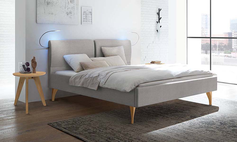 Bedframe Pulciano 23 with wooden legs Lana and headboard Grace with cushion Flora