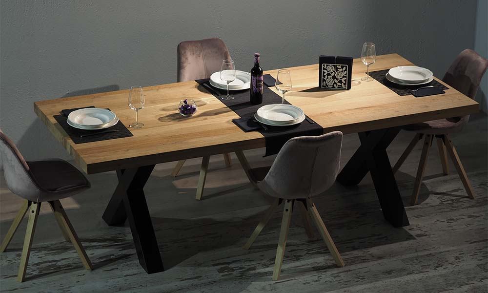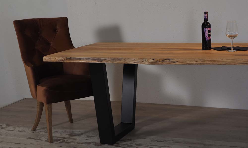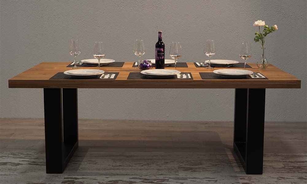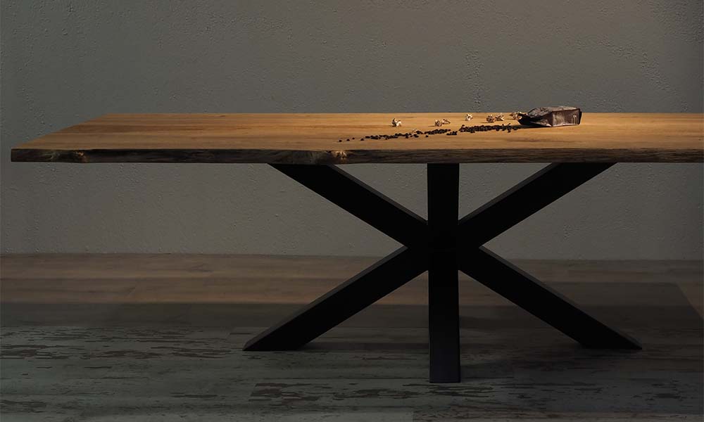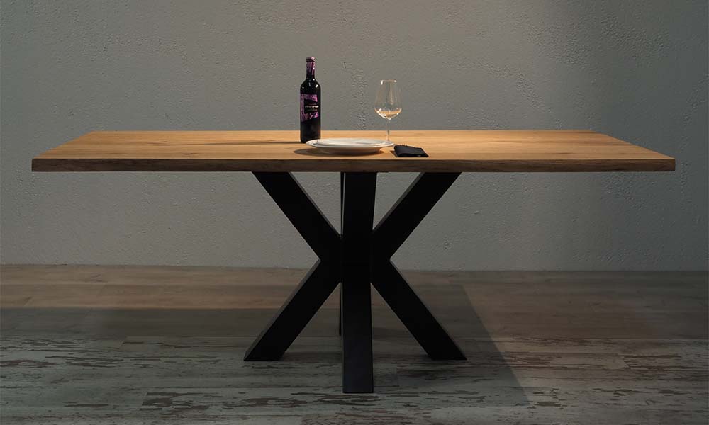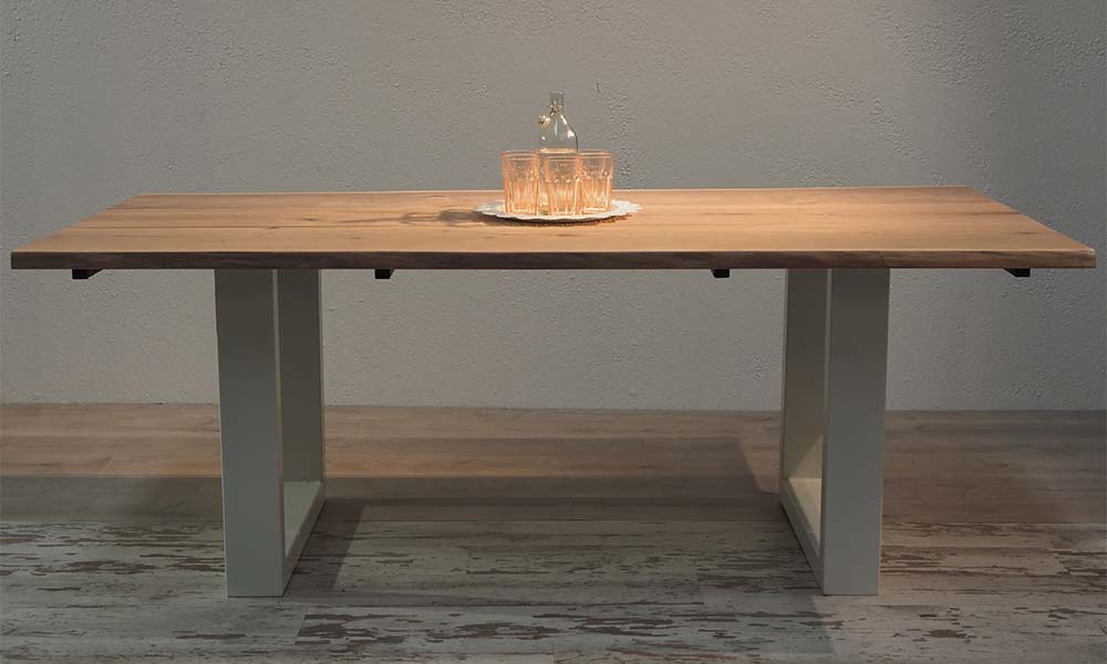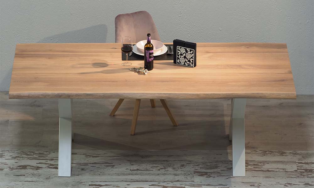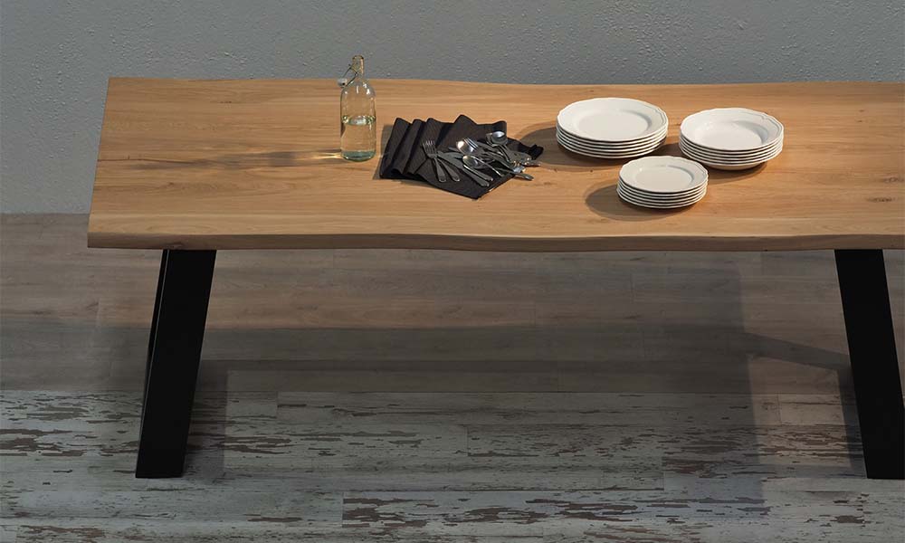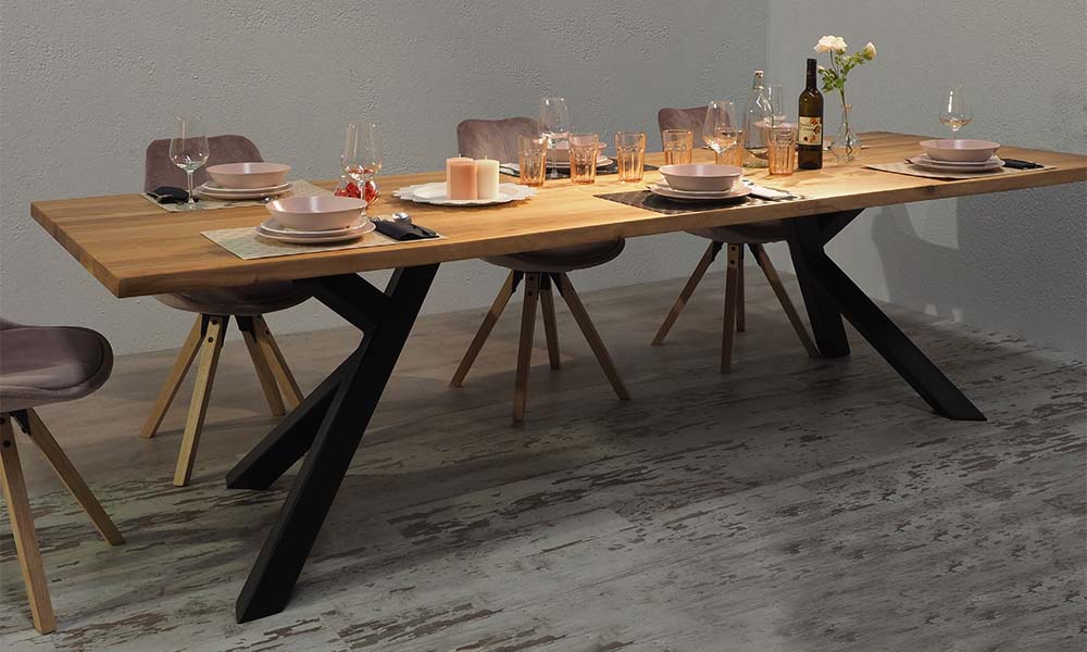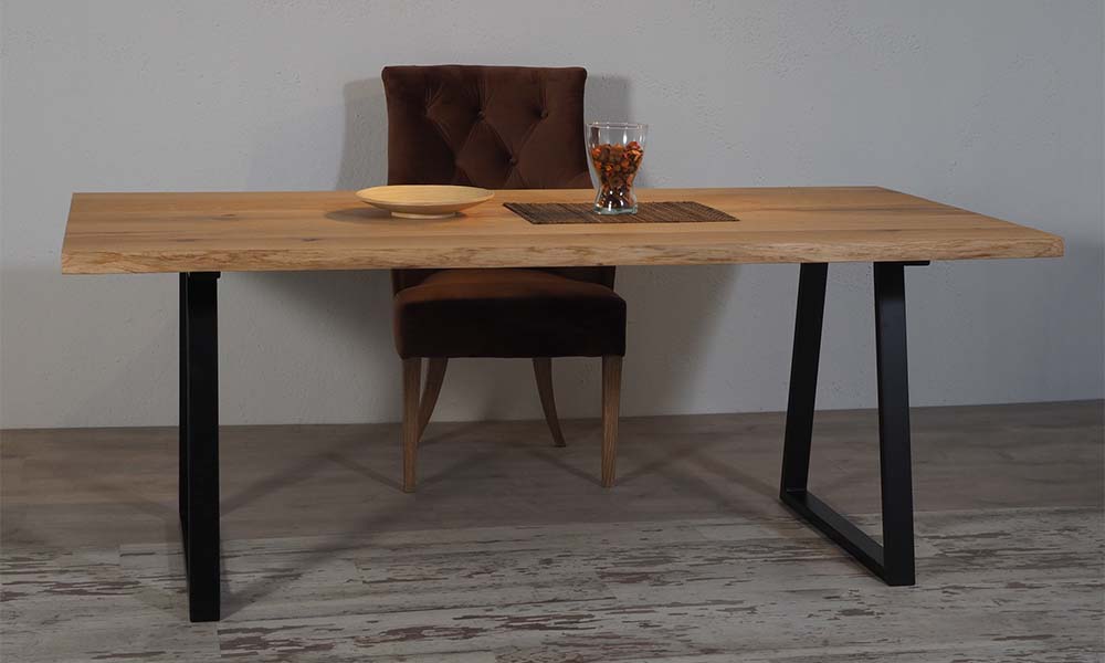 Oak & Iron bietet Esstische mit massiver Eichenplatte in Grössen von 140 x 90 cm bis 350 x 110 cm an. Die Tischplatten gibt es in verschiedenen Ausführungen und entweder mit gerader Kante oder Naturkante. Die Tischfüsse können aus einer Reihe von Eisenfüssen oder Holzfüssen ausgewählt werden.