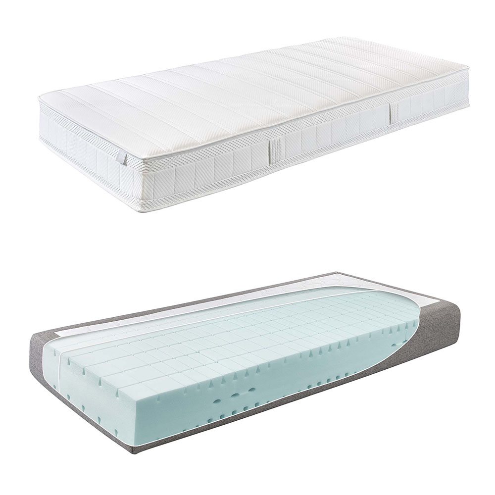 Ursprünglich bezeichnete der Name Boxspring nichts anderes als einen Bettunterbau, meist aus Holz, mit Springfedern darin, auf den man dann eine Federkernmatratze legte. Heute bieten viele Hersteller nicht nur wesentlich punktelastischere Taschenfederkernmatratzen statt der ziemlich starren Federkernmatratzen an, sondern auch zunehmend Schaum- bzw. Kaltschaummatratzen. Hasena stellt hier 4 Schaumstoff- und 5 Taschenfederkernmatratzen zur Auswahl.